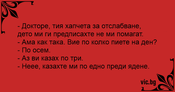 - Докторе, тия хапчета за отслабване, дето ми ги предписахте не ми помагат.