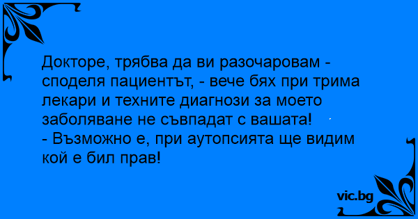 - Innan jag kom hit, doktorn, så har jag varit hos flera andra läkare, och de ställde en helt annan diagnos än er. - Det kan hända, men obduktionen kommer att visa att min är rätt.