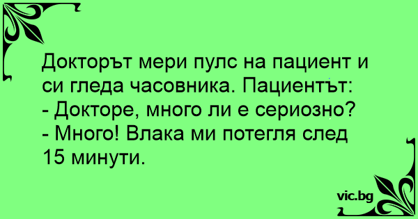 Докторът мери пулс на пациент и си гледа часовника. Пациентът: