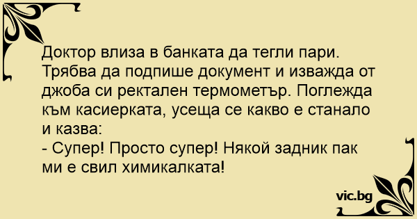 Трябва да подпише документ и изважда от джоба си ректален термометър. Поглежда към касиерката, усеща се какво е станало и казва: