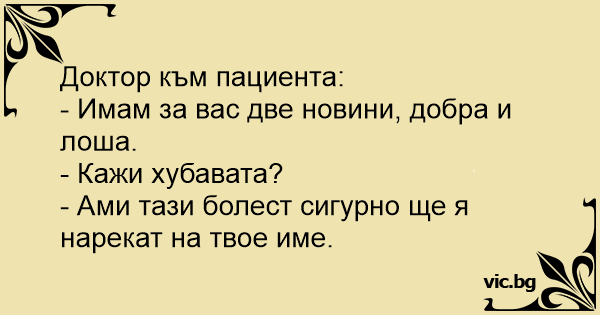 Medicul către pacient: - Domnule, am nişte veşti bune şi nişte veşti proaste. Cu care să încep? - Dă-mi o veste bună, doctore! - Boala asta va purta numele tău!