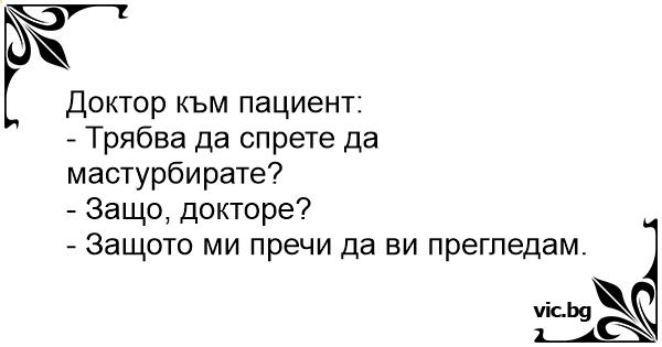 Ārsts pacientam: "Jums jāpārtarauc masturbēt". - "Kāpēc, daktera kungs?"- "Tapēc , ka tas traucē jūsu apskati"