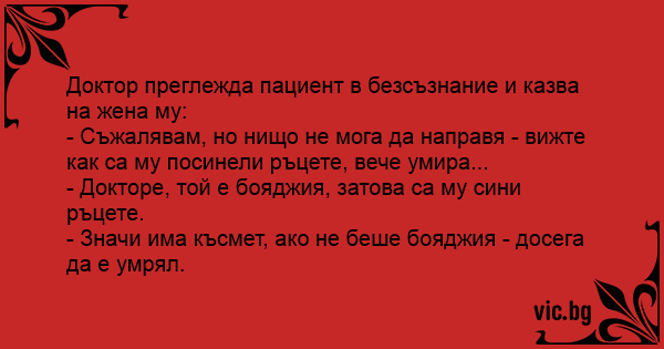 Доктор преглежда пациент в безсъзнание и казва на жена му: