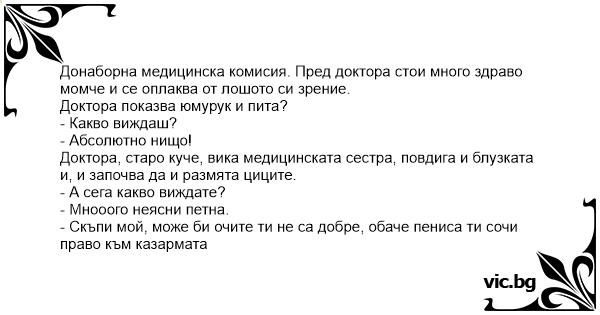 Донаборна медицинска комисия. Пред доктора стои много здраво момче и се оплаква от лошото си зрение.