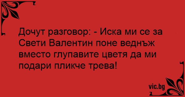 Дочут разговор: - Иска ми се за Свети Валентин поне веднъж вместо глупавите цветя да ми подари пликче трева!