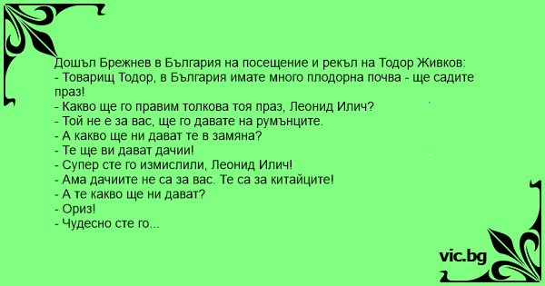 Дошъл Брежнев в България на посещение и рекъл на Тодор Живков: