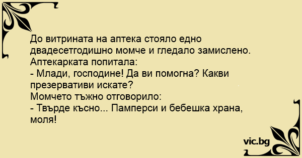 До витрината на аптека стояло едно двадесетгодишно момче и гледало замислено. Аптекарката попитала:
