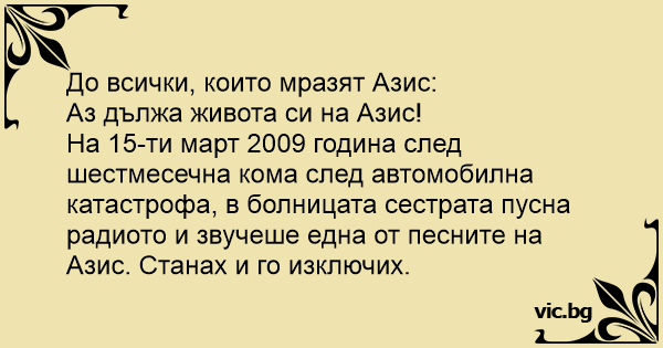 На 15-ти март 2009 година след шестмесечна кома след автомобилна катастрофа, в болницата сестрата пусна радиото и звучеше една от песните на Азис. Станах и го изключих.