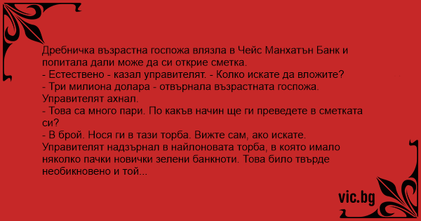 - Оставете го този нещастник - отвърнала дребничката възрастна госпожа. - Разбирате ли, обзаложих се с него на един милион долара, че до днес на обяд ще съм хванала президента на Чейс Манхатън Банк за taшaциte!