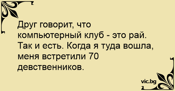 Друг говорит, что компьютерный клуб - это рай. Так и есть. Когда я туда вошла, меня встретили 70 девственников.