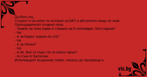 Студент е на изпит по история на БКП и абсолютно нищо не знае. Преподавателят отчаяно пита: