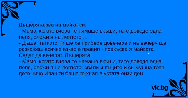 - Дъще, таткото ти ще се прибере довечера и на вечеря ще разкажеш всичко какво е правил - прекъсва я майката.