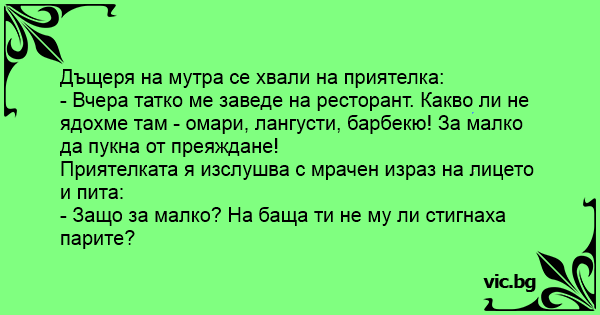 - Вчера татко ме заведе на ресторант. Какво ли не ядохме там - омари, лангусти, барбекю! За малко да пукна от преяждане!
