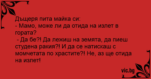- Да бе?! Да лежиш на земята, да пиеш студена ракия?! И да се натискаш с момчетата по храстите?! Не, аз ще отида на излет!