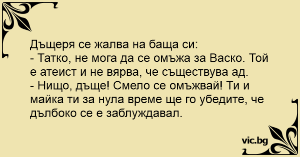 - Татко, не мога да се омъжа за Васко. Той е атеист и не вярва, че съществува ад.