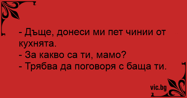— Доню, принеси мені 5 тарілок із кухні! — Навіщо, мамуню? — Мені треба про дещо поговорити з твоїм татком.