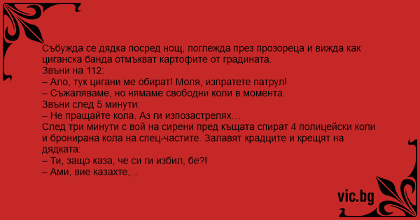 – Ало, тук цигани ме обират! Моля, изпратете патрул!