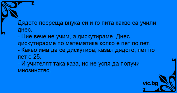 - Ние вече не учим, а дискутираме. Днес дискутирахме по математика колко е пет по пет.