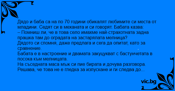 Старците стигат и дядото си сваля панталоните, а бабата си вдига полата, обръща се с лице към оградата и се обляга на нея за подпора. Дядото не губи и секунда и започва един луд cekc, едни движения, едни въртележки, такава гъвкавост, като на 18 годишни любовници. Бабата бута назад, дядото напред, бабата дере с ръце, дядото стиска хълбоци като за последно, двамата скимтят от удоволствие и екстаз, "О,Боже!" оглася гората.