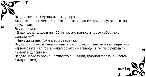 Дядото набързо броил на хлапето 100 кинта, грабнал флакона и бегом вкъщи... След половин час бабата излиза от къщи и му дава още 100 кинта.