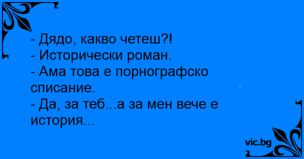 Estaba un viejito leyendo un libro de sexo, y en eso llega otro y le pregunta: - ¿Qué estás leyendo? A lo que le responde: - Estoy leyendo historia. - ¿Pero si ese libro es de sexo? - Por eso, para...