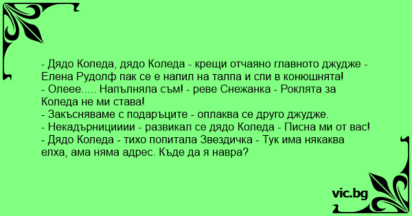 - Дядо Коледа, дядо Коледа - крещи отчаяно главното джудже - Елена Рудолф пак се е напил на талпа и спи в конюшнята!