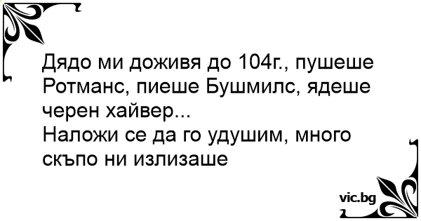 Дядо ми доживя до 104г., пушеше Ротманс, пиеше Бушмилс, ядеше черен хайвер...