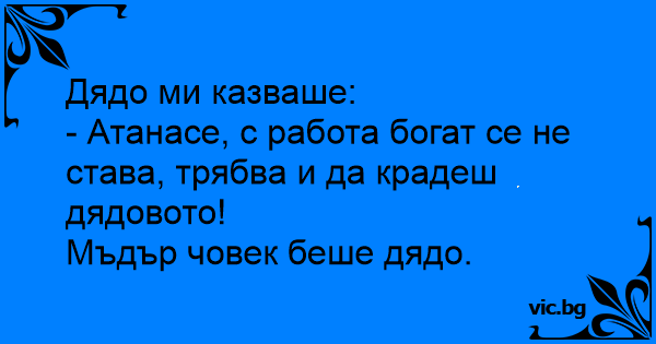- Атанасе, с работа богат се не става, трябва и да крадеш дядовото!