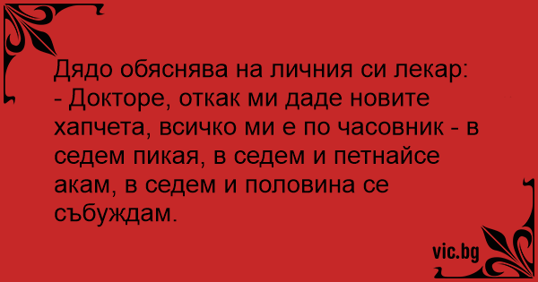 - Докторе, откак ми даде новите хапчета, всичко ми е по часовник - в седем пикая, в седем и петнайсе акам, в седем и половина се събуждам.