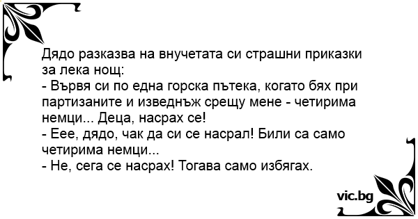 - Еее, дядо, чак да си се насрал! Били са само четирима немци...