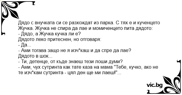 - Ами, чух сутринта как тате каза на мама "Тебе, kучko, ако не те изчуkam сутринта - цял ден ще ми лаеш!"...