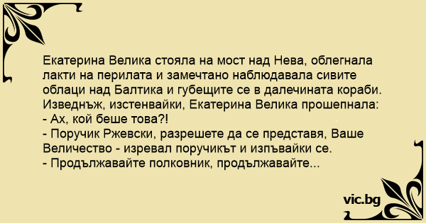 - Поручик Ржевски, разрешете да се представя, Ваше Величество - изревал поручикът и изпъвайки се.