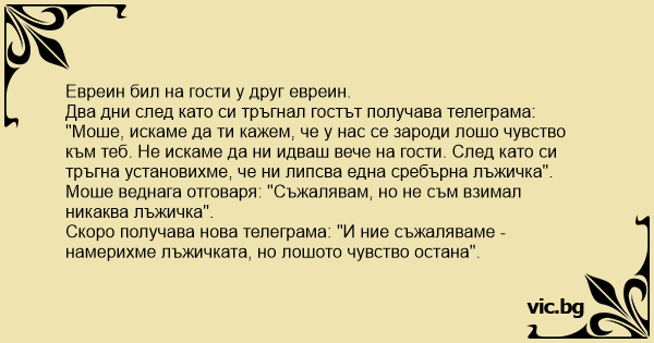 Два дни след като си тръгнал гостът получава телеграма: "Моше, искаме да ти кажем, че у нас се зароди лошо чувство към теб. Не искаме да ни идваш вече на гости. След като си тръгна установихме, че ни липсва една сребърна лъжичка".