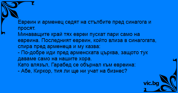 Евреин и арменец седят на стълбите пред синагога и просят.