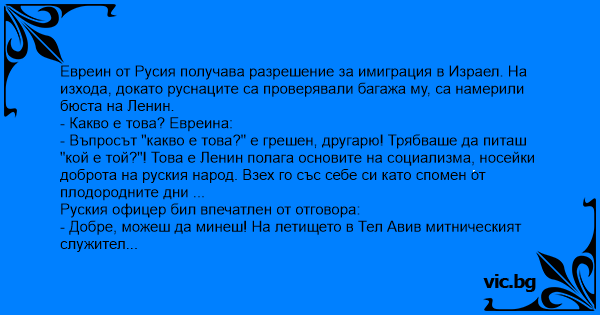 Евреин от Русия получава разрешение за имиграция в Израел. На изхода, докато руснаците са проверявали багажа му, са намерили бюста на Ленин.