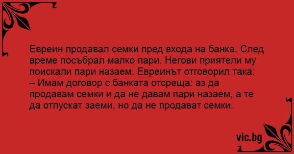 Евреин продавал семки пред входа на банка. След време посъбрал малко пари. Негови приятели му поискали пари назаем. Евреинът отговорил така: