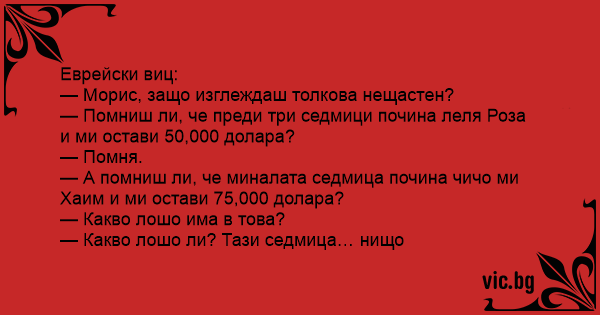 — А помниш ли, че миналата седмица почина чичо ми Хаим и ми остави 75,000 долара?