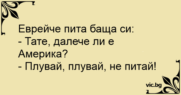 Jantje: Mam, hoe ver is het nog naar Amerika? Moeder: Niet aanstellen Jantje, door zwemmen!