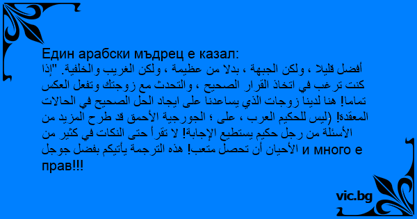 أفضل قليلا ، ولكن الجبهة ، بدلا من عظيمة ، ولكن الغريب والخلفية. "إذا كنت ترغب في اتخاذ القرار الصحيح ، والتحدث مع زوجتك وتفعل العكس تماما! هنا لدينا زوجات الذي يساعدنا على ايجاد الحل الصحيح في الحالات المعقدة! (ليس للحكيم العرب ، على ؛ الجورجية الأحمق قد طرح المزيد من الأسئلة من رجل حكيم يستطيع الإجابة! لا تقرأ حتى النكات في كثير من الأحيان أن تحصل متعب! هذه الترجمة يأتيكم بفضل جوجل и много е прав!!!
