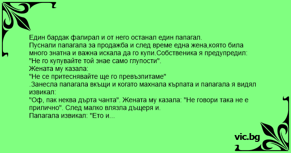 Папагала извикал: "Ето и една пачавра". Жената казала: