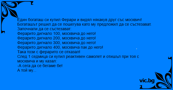 Един богаташ си купил Ферари и видял някакув друг със москвич!
