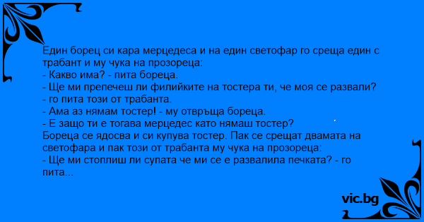 Един борец си кара мерцедеса и на един светофар го среща един с трабант и му чуka на прозореца: