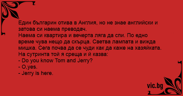Доаѓа Ставре во Њујорк и изнајмува стан. Во него полно глувци. Сака да пријави кај газдата, ама не знае англиски. Го вика, овој го прашува: - What's the problem? Ставре: - Мммм, Tom and Jerry, you...