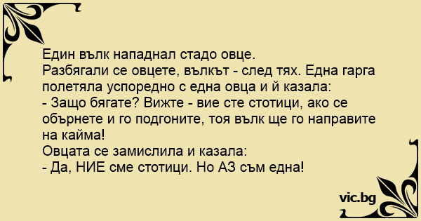 Разбягали се овцете, вълкът - след тях. Една гарга полетяла успоредно с една овца и й казала: