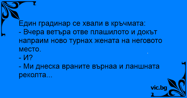 - Вчера ветъра отве плашилото и докът напраим ново турнах жената на неговото место.