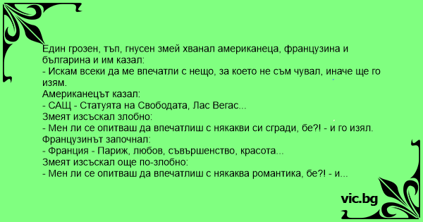 Един грозен, тъп, гнусен змей хванал американеца, французина и българина и им казал: