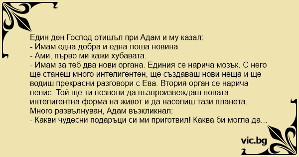 Intr-o zi, Dumnezeu il cheama pe Adam si-i spune: - Am sa-ti dau doua vesti: una buna si una rea. Cu care sa incep? - Pai, spune-o pe aia buna, zice Adam. - Am doua organe noi pentru tine, spune...