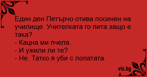 Отива Иванчо на училище с подута и насинена буза. Учителката го пита: