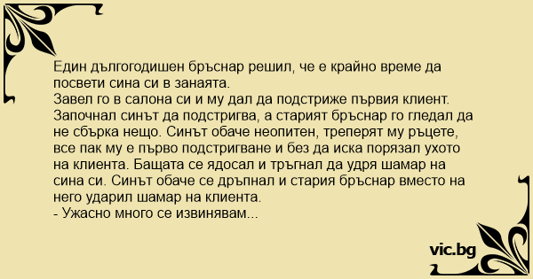 Завел го в салона си и му дал да подстриже първия клиент. Започнал синът да подстригва, а старият бръснар го гледал да не сбърка нещо. Синът обаче неопитен, треперят му ръцете, все пак му е първо подстригване и без да иска порязал ухото на клиента. Бащата се ядосал и тръгнал да удря шамар на сина си. Синът обаче се дръпнал и стария бръснар вместо на него ударил шамар на клиента.