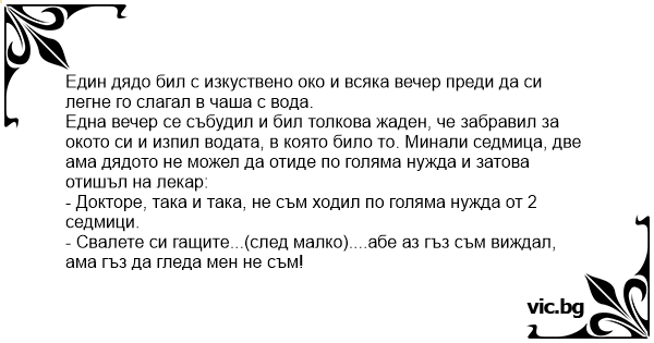 Един дядо бил с изкуствено око и всяка вечер преди да си легне го слагал в чаша с вода.